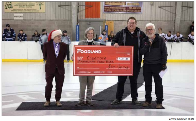 St. Luke’s Anglican Church Rev. Lorna May accepts a $500 donation to the Creemore Community Food Bank from Sim Spry of Creemore Foodland at the Dec. 10 Creemore Coyotes hockey game, flanked by general manager Tom Macham (right) and assistant general manager Fred Mills. The game was dedicated to supporting those affected by the Mill Street fire and raised an additional $500, collected in donation jars, through a portion of proceeds from ticket sales and from the visiting team, the Saugeen Shores Winterhawks.